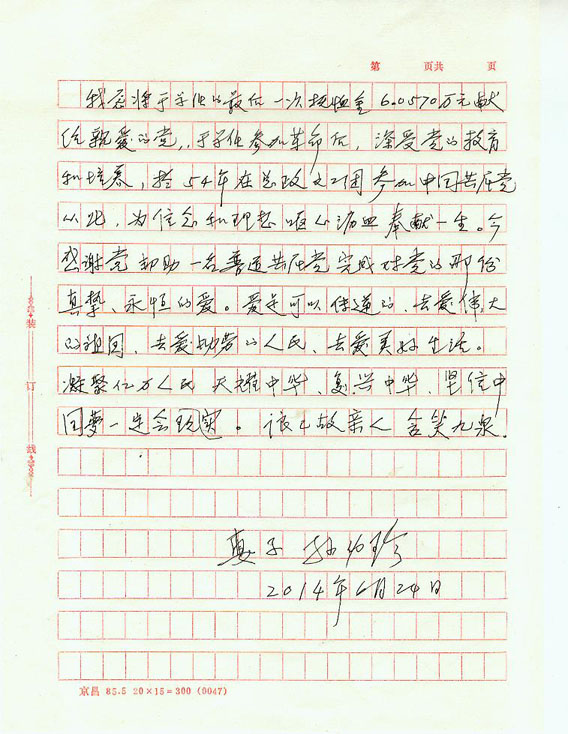 “我老伴能夠陪我這么長時間,都是因為黨的關懷和出版社的幫助?!贝藭r此刻,孫幼珍老人對黨的感激,對出版社的感謝化作眼角的淚光閃爍。在出版社李鋒 書記、來豫蓉副書記面前,她從黃色的破布口袋里掏出一個塑料口袋,里面整齊的裝著六萬零五百七十元人民幣,這是科學出版社在于學任離世后一次性發放的撫恤 金,孫幼珍親自到銀行如數取出,還叮囑銀行工作人員盡量要嶄新的人民幣,她不想麻煩出版社,拒絕單位派車接送,為了不引人注意她用破布口袋裝錢,遵照于學 任生前的愿望,將這份沉甸甸的深情交到書記手中。一直保持微笑的她聲音突然哽咽的說:“錢很少,但是表達了我們對黨的愛,他再也不能為黨做些什么了,這是 他最后的心意,感謝你們幫助他完成最后的心愿?!迸c黨費一起交到書記手中的,還有孫幼珍老人親筆書寫的一封信,她的視力已經很微弱,在放大鏡的幫助下寫了 這樣一段慷慨激昂的話:“我愿將于學任的最后一次撫恤金6.0570萬元獻給親愛的黨,于學任參加革命后,深受黨的教育和培養,于54年在總政文工團參加 中國共產黨,從此,為信念和理想嘔心瀝血奉獻一生。今天感謝黨幫助一名普通共產黨(員)完成對黨的那份真摯、永恒的愛。愛是可以傳遞的,去愛偉大的祖國, 去愛勤勞的人民,去愛美好生活。凝聚億萬人民,天耀中華,復興中華,堅信中國夢一定會實現,望已故親人含笑九泉?!?/p>