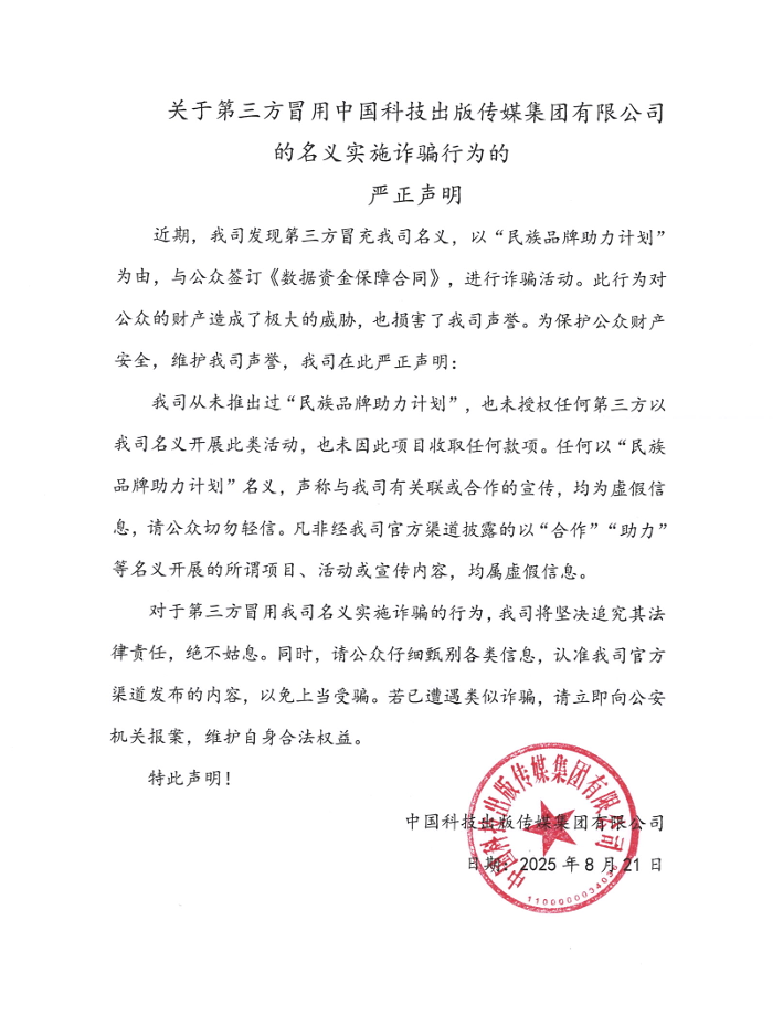 關(guān)于第三方冒用中國科技出版?zhèn)髅郊瘓F(tuán)有限公司的名義實施詐騙行為的嚴(yán)正聲明